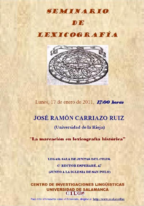 José Ramón Carriazo, investigador del  Instituto “Historia de la Lengua” de Cilengua, presenta esta tarde la ponencia La marcación en lexicografía histórica, dentro del “Seminario de lexicografía” que se celebra en el Centro de Investigaciones Lingüísticas de la Universidad de Salamanca (CILUS).