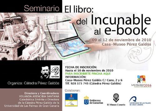El Director del Instituto Biblioteca Hispánica de Cilengua, Pedro M. Cátedra, dictará mañana, día 9 de noviembre, la ponencia ¿Qué es un libro? Función/significación/actualidad de un incunable. El libro en su historia. El diseño editorial, en el Seminario «El libro: del incunable al e-book», organizado por la Cátedra Pérez Galdós, que tendrá lugar del 9 al 12 de noviembre de 2010 en la Casa Museo Pérez Galdós de Las Palmas de Gran Canaria.