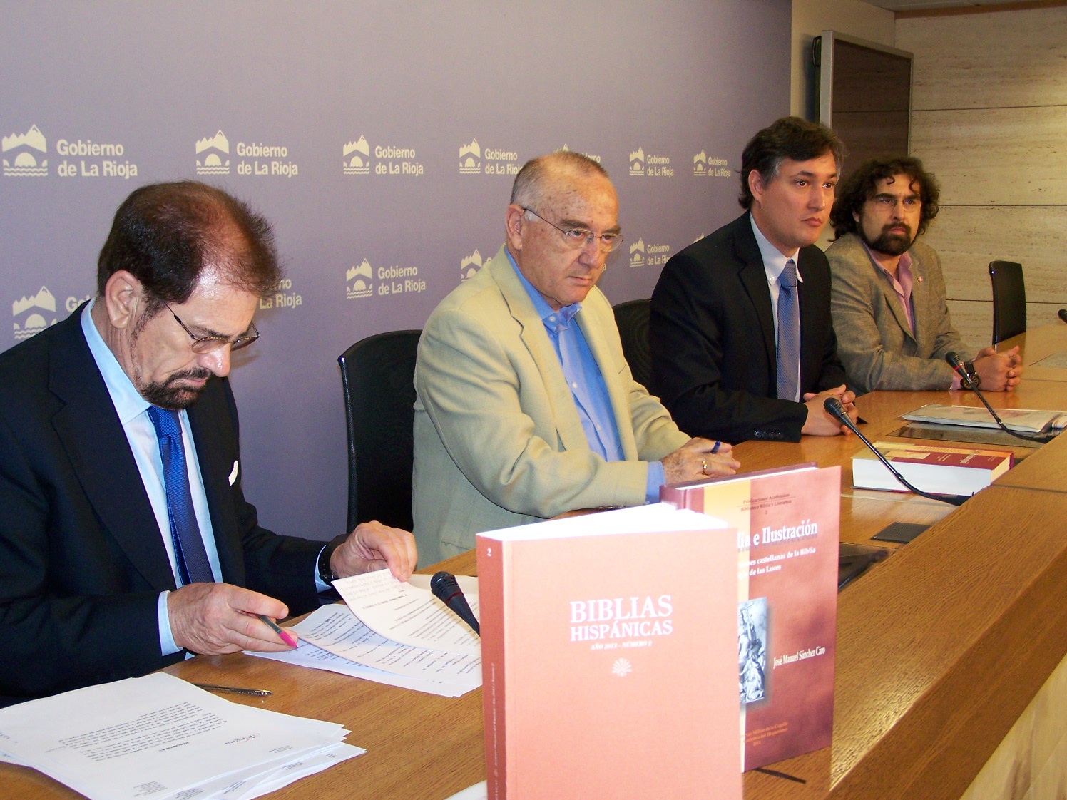 El director general de Cultura y vicepresidente de la Fundación San Millán de la Cogolla, José Luis Pérez Pastor; el director del Instituto Orígenes del Español de Cilengua, Claudio García Turza; el investigador y secretario de gestión académica de este instituto, Juan Antonio Martínez Berbel y el profesor Francisco Gimeno presentan las últimas publicaciones del Centro.