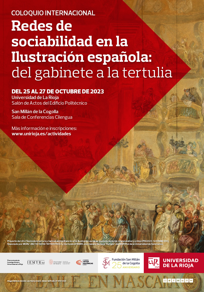 El «Coloquio Internacional. Redes de sociabilidad en la Ilustración española: del gabinete a la tertulia» se celebra del miércoles, día 25, al viernes, 27 de octubre, organizado por la Universidad de La Rioja y la Fundación San Millán – Cilengua, con el fin de presentar resultados inéditos de estudios en este campo. Este encuentro cuenta con la colaboración del Vicerrectorado de Investigación e Internacionalización y del Grupo de Investigación Teatro del Siglo de Oro (TESORO) de la Universidad de La Rioja, y el Grupo de Investigación Siglo de Oro de la Universidad de Navarra.