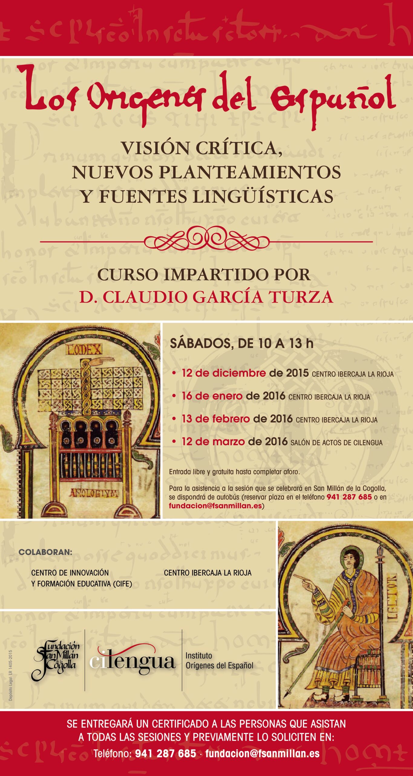 Este curso, impartido por Claudio García Turza, quiere, en primer lugar, divulgar de la forma más sencilla y clara posible el contenido de las investigaciones desarrolladas, particularmente en Cilengua, sobre el romance primitivo hispano y, en especial, sobre la aportación de los escritorios riojanos altomedievales a su proceso formativo y a su evolución. En segundo lugar, actualizar los conocimientos sobre esta compleja temática, tan debatida entre los hispanistas en las últimas décadas y, por último, dar a conocer los principales problemas que suscitan las primeras fuentes españolas del iberorromance primitivo: lugar y fecha de copia, fuentes, propósito, adscripción dialectológica y caracterización lingüística.