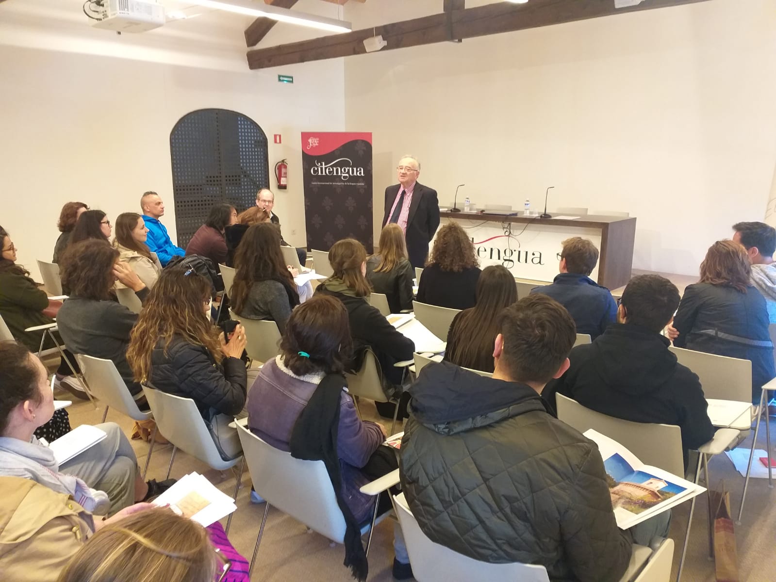 Un grupo de alumnos y profesores de la Universidad de Zúrich participan en una conferencia sobre los orígenes del español en Cilengua